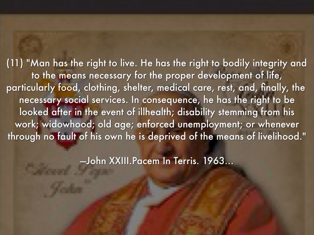 (11) "Man has the right to live. He has the right to bodily integrity and to the means necessary for the proper development of life, particularly food, clothing, shelter, medical care, rest, and, finally, the necessary social services. In consequence, he has the right to be looked after in the event of illhealth; disability stemming from his work; widowhood; old age; enforced unemployment; or whenever through no fault of his own he is deprived of the means of livelihood."