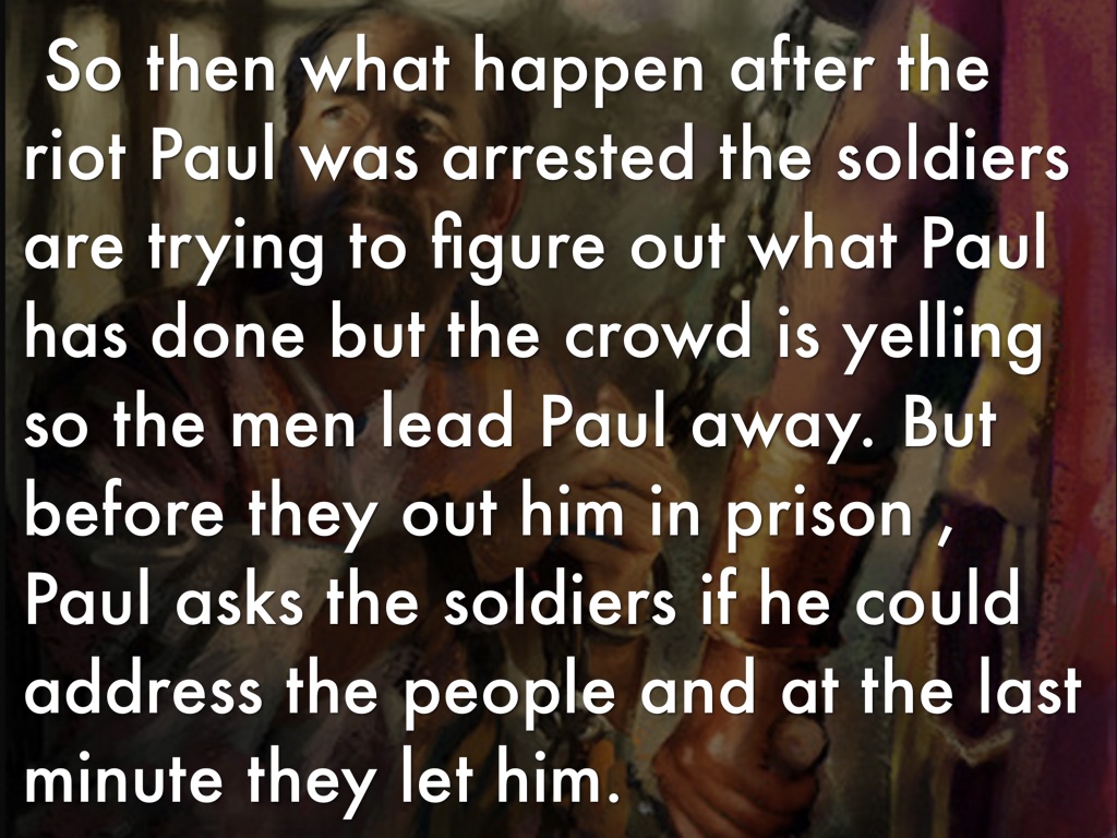 So then what happen after the riot Paul was arrested the soldiers are trying to figure out what Paul has done but the crowd is yelling so the men lead Paul away. But before they out him in prison , Paul asks the soldiers if he could address the people and at the last minute they let him.
