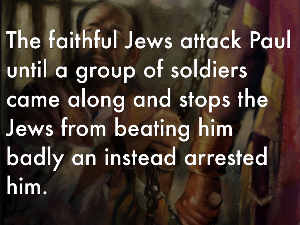 The faithful Jews attack Paul until a group of soldiers came along and stops the Jews from beating him badly an instead arrested him.