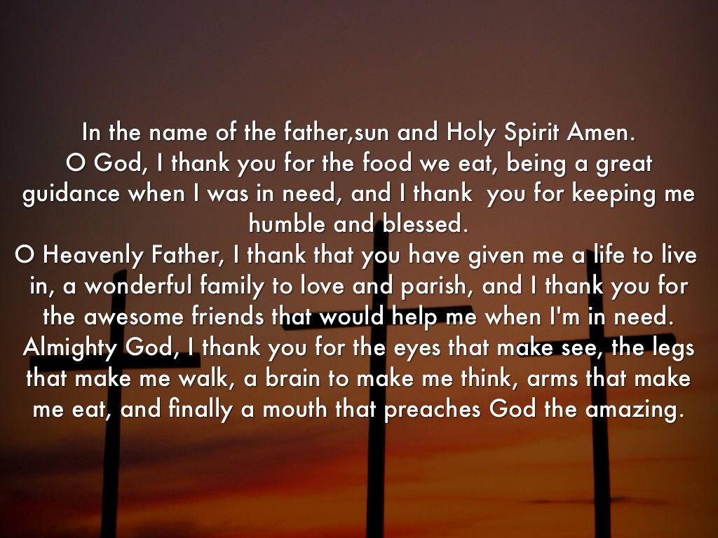 O God, I thank you for the food we eat, being a great guidance when I was in need, and I thank you for keeping me humble and blessed.