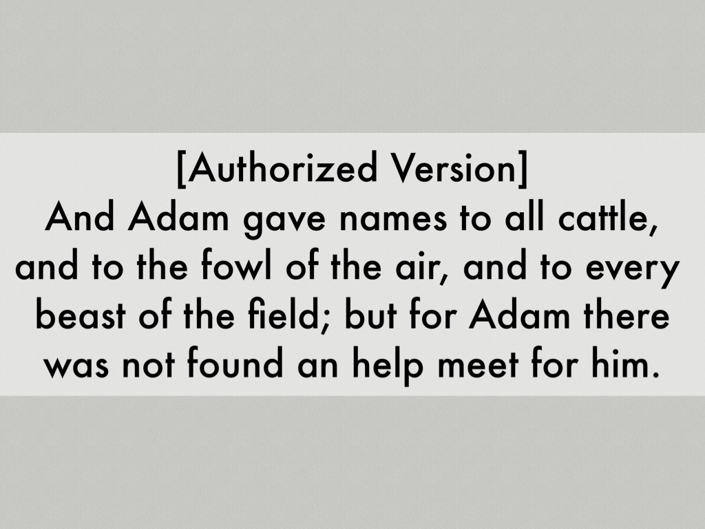 [Authorized Version] And Adam gave names to all cattle, and to the fowl of the air, and to every beast of the field; but for Adam there was not found an help meet for him.
