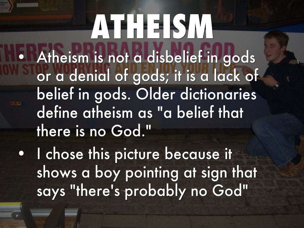 • Atheism is not a disbelief in gods or a denial of gods; it is a lack of belief in gods. Older dictionaries define atheism as "a belief that there is no God."