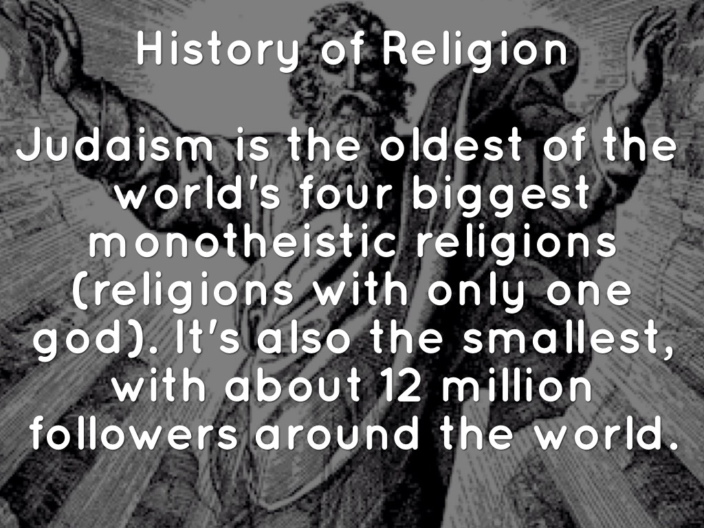 Judaism is the oldest of the world's four biggest monotheistic religions (religions with only one god). It's also the smallest, with about 12 million followers around the world.