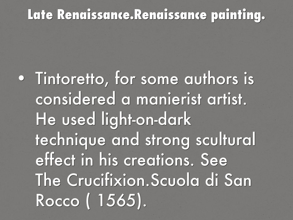 Tintoretto, for some authors is considered a manierist artist. He used light-on-dark technique and strong scultural effect in his creations. See The Crucifixion.Scuola di San Rocco ( 1565).