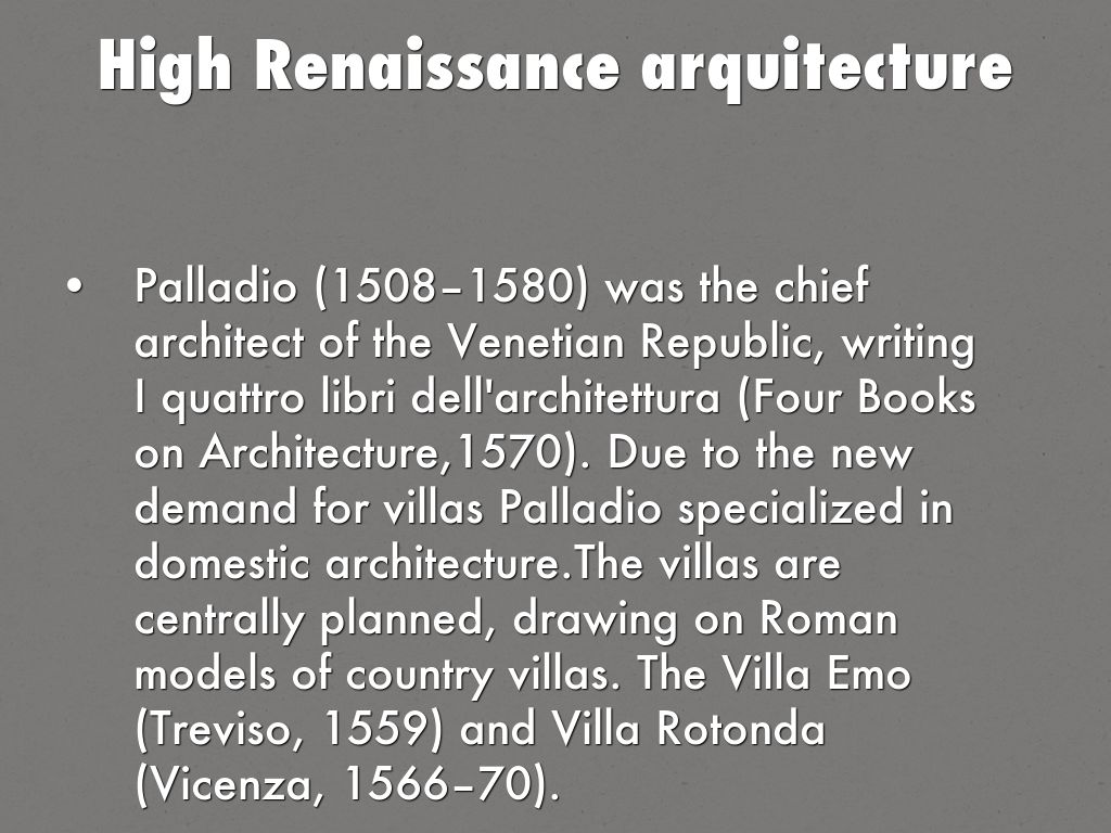 Palladio (1508–1580) was the chief architect of the Venetian Republic, writing I quattro libri dell'architettura (Four Books on Architecture,1570). Due to the new demand for villas Palladio specialized in domestic architecture.The villas are centrally planned, drawing on Roman models of country villas. The Villa Emo (Treviso, 1559) and Villa Rotonda (Vicenza, 1566–70).