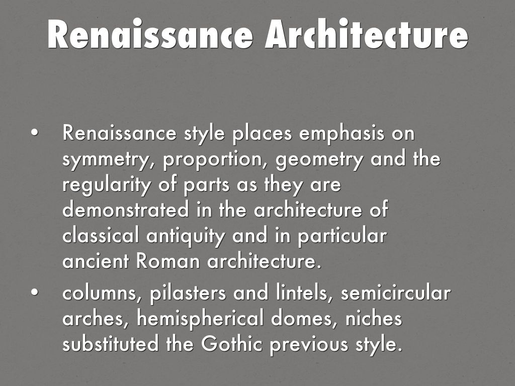 Renaissance style places emphasis on symmetry, proportion, geometry and the regularity of parts as they are demonstrated in the architecture of classical antiquity and in particular ancient Roman architecture.