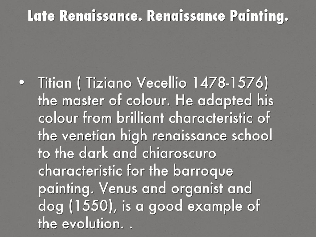Titian ( Tiziano Vecellio 1478-1576) the master of colour. He adapted his colour from brilliant characteristic of the venetian high renaissance school to the dark and chiaroscuro characteristic for the barroque painting. Venus and organist and dog (1550), is a good example of the evolution. .