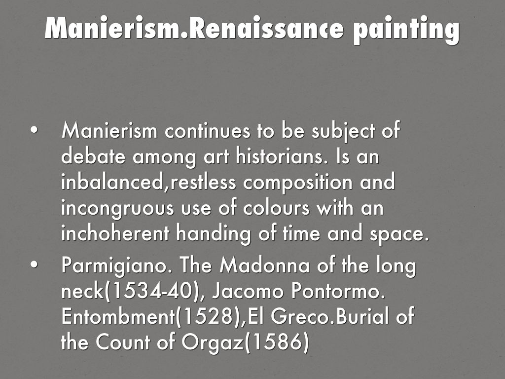 Parmigiano. The Madonna of the long neck(1534-40), Jacomo Pontormo. Entombment(1528),El Greco.Burial of the Count of Orgaz(1586)