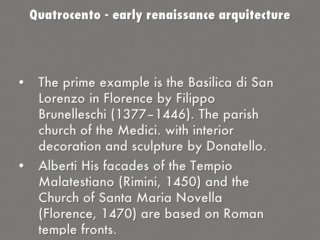 The prime example is the Basilica di San Lorenzo in Florence by Filippo Brunelleschi (1377–1446). The parish church of the Medici. with interior decoration and sculpture by Donatello.