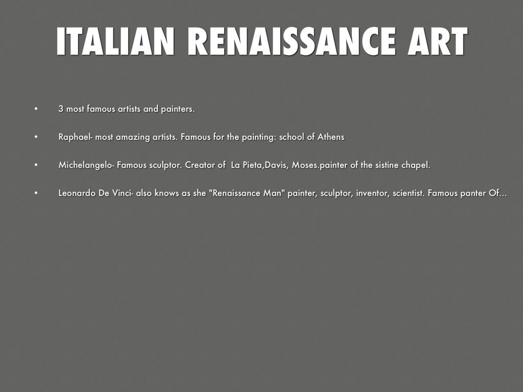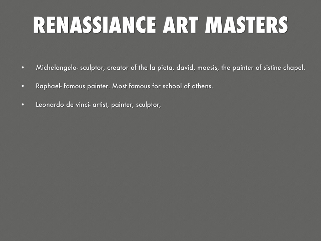 Michelangelo- Famous sculptor. Creator of La Pieta,Davis, Moses.painter of the sistine chapel.