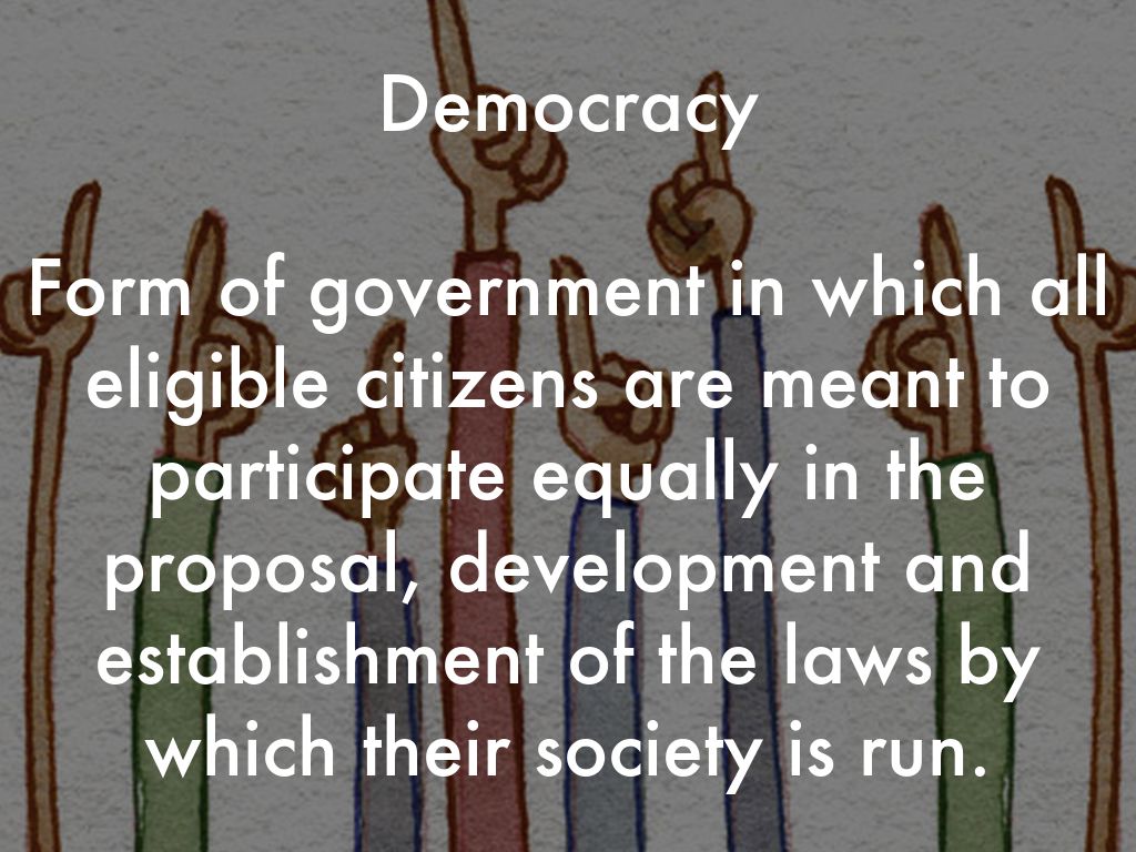Form of government in which all eligible citizens are meant to participate equally in the proposal, development and establishment of the laws by which their society is run.