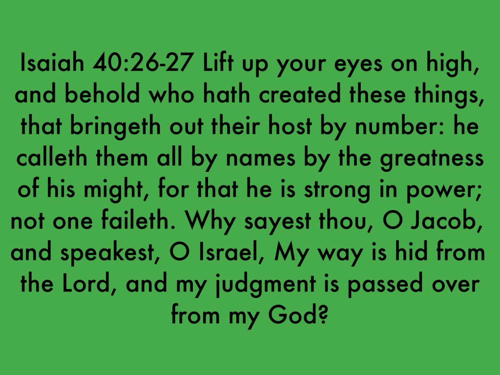 Isaiah 40:26-27 Lift up your eyes on high, and behold who hath created these things, that bringeth out their host by number: he calleth them all by names by the greatness of his might, for that he is strong in power; not one faileth. Why sayest thou, O Jacob, and speakest, O Israel, My way is hid from the Lord, and my judgment is passed over from my God?