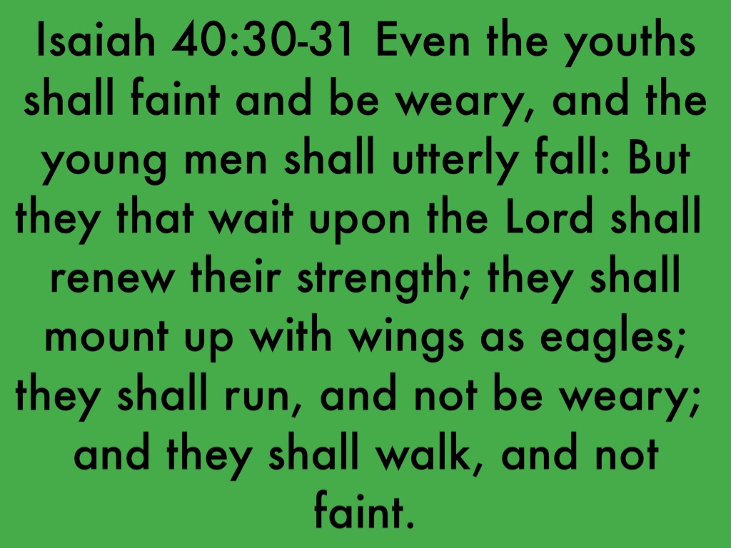 Isaiah 40:30-31 Even the youths shall faint and be weary, and the young men shall utterly fall: But they that wait upon the Lord shall renew their strength; they shall mount up with wings as eagles; they shall run, and not be weary; and they shall walk, and not faint.