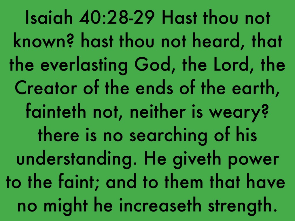 Isaiah 40:28-29 Hast thou not known? hast thou not heard, that the everlasting God, the Lord, the Creator of the ends of the earth, fainteth not, neither is weary? there is no searching of his understanding. He giveth power to the faint; and to them that have no might he increaseth strength.