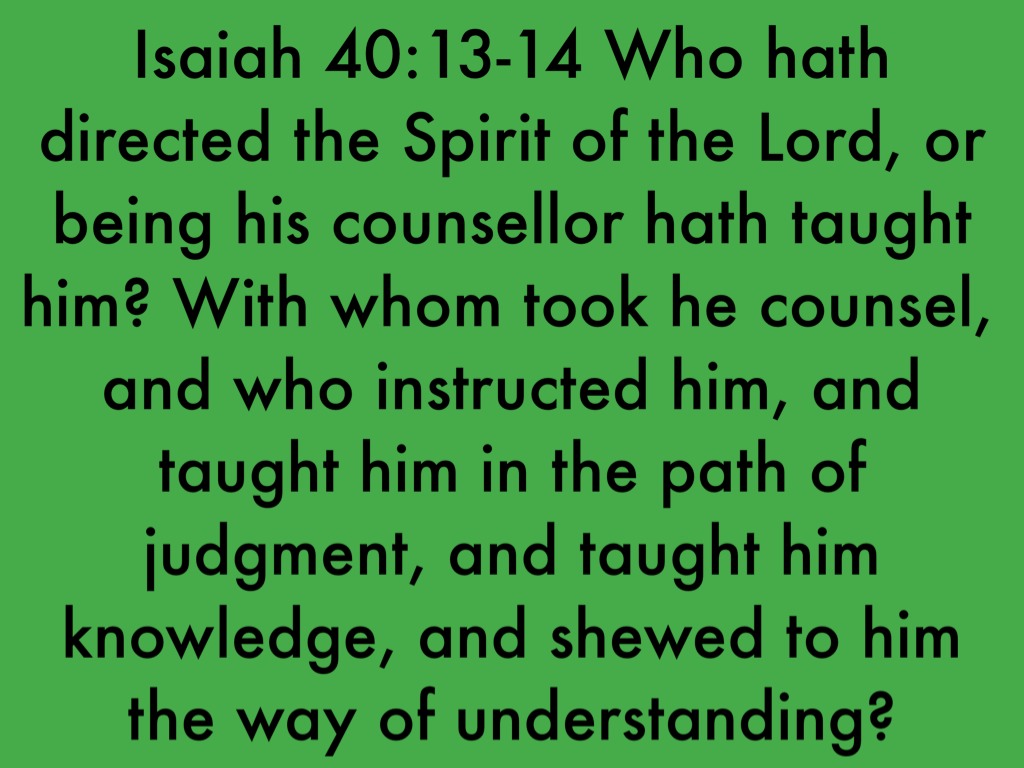 Isaiah 40:13-14 Who hath directed the Spirit of the Lord, or being his counsellor hath taught him? With whom took he counsel, and who instructed him, and taught him in the path of judgment, and taught him knowledge, and shewed to him the way of understanding?