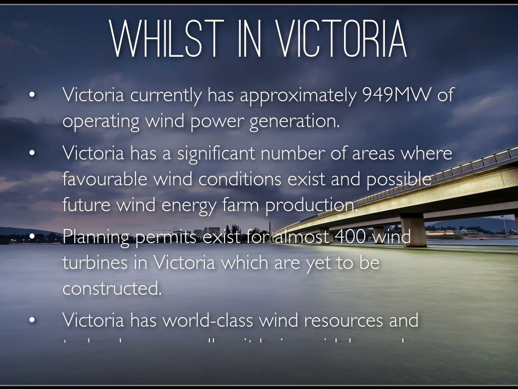 • Victoria has world-class wind resources and technology, as well as it being widely used around the world to provide reliable supplies of energy.