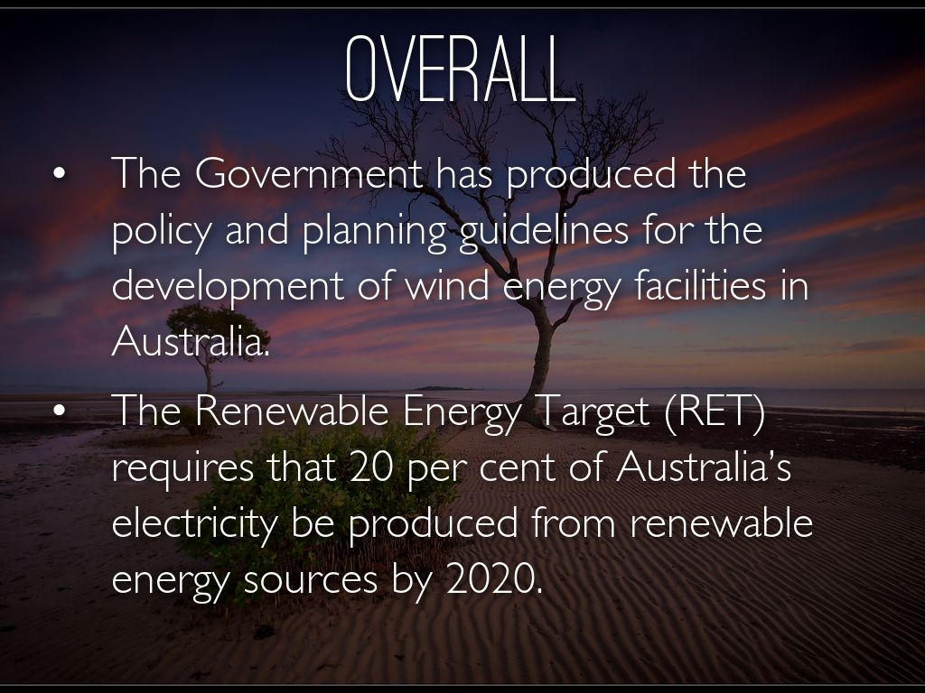 • The Government has produced the policy and planning guidelines for the development of wind energy facilities in Australia.