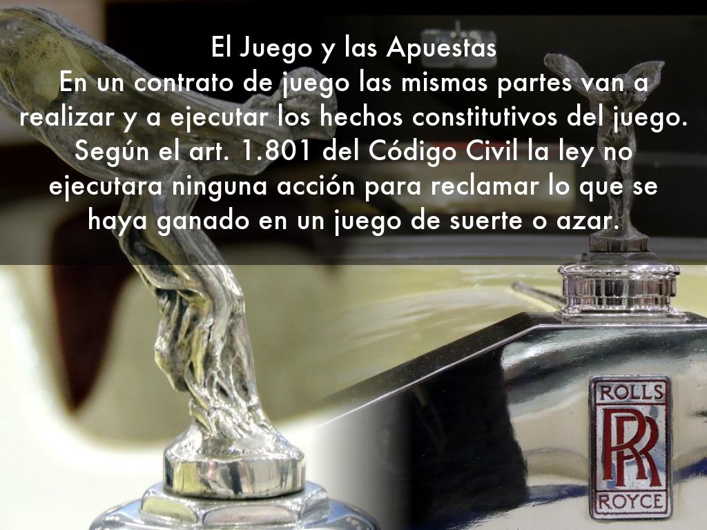El Juego y las Apuestas En un contrato de juego las mismas partes van a realizar y a ejecutar los hechos constitutivos del juego. Según el art. 1.801 del Código Civil la ley no ejecutara ninguna acción para reclamar lo que se haya ganado en un juego de suerte o azar.