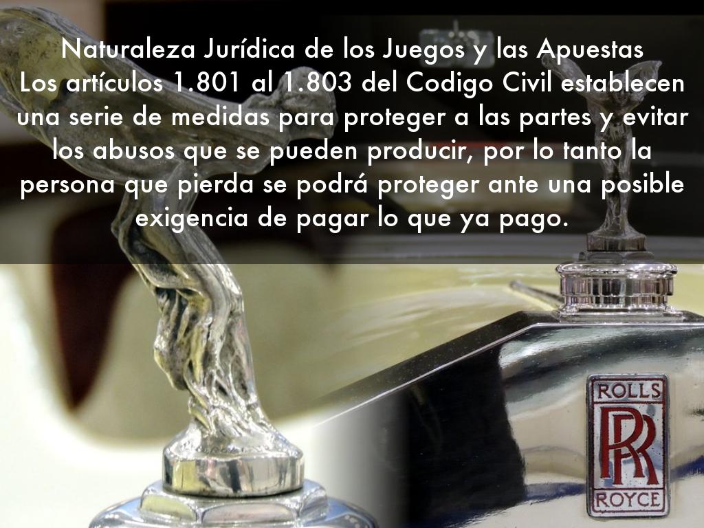 Naturaleza Jurídica de los Juegos y las Apuestas Los artículos 1.801 al 1.803 del Codigo Civil establecen una serie de medidas para proteger a las partes y evitar los abusos que se pueden producir, por lo tanto la persona que pierda se podrá proteger ante una posible exigencia de pagar lo que ya pago.