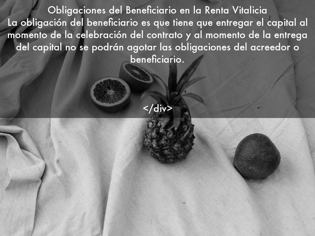 Obligaciones del Beneficiario en la Renta Vitalicia La obligación del beneficiario es que tiene que entregar el capital al momento de la celebración del contrato y al momento de la entrega del capital no se podrán agotar las obligaciones del acreedor o beneficiario.