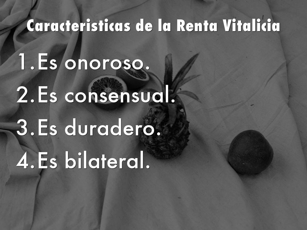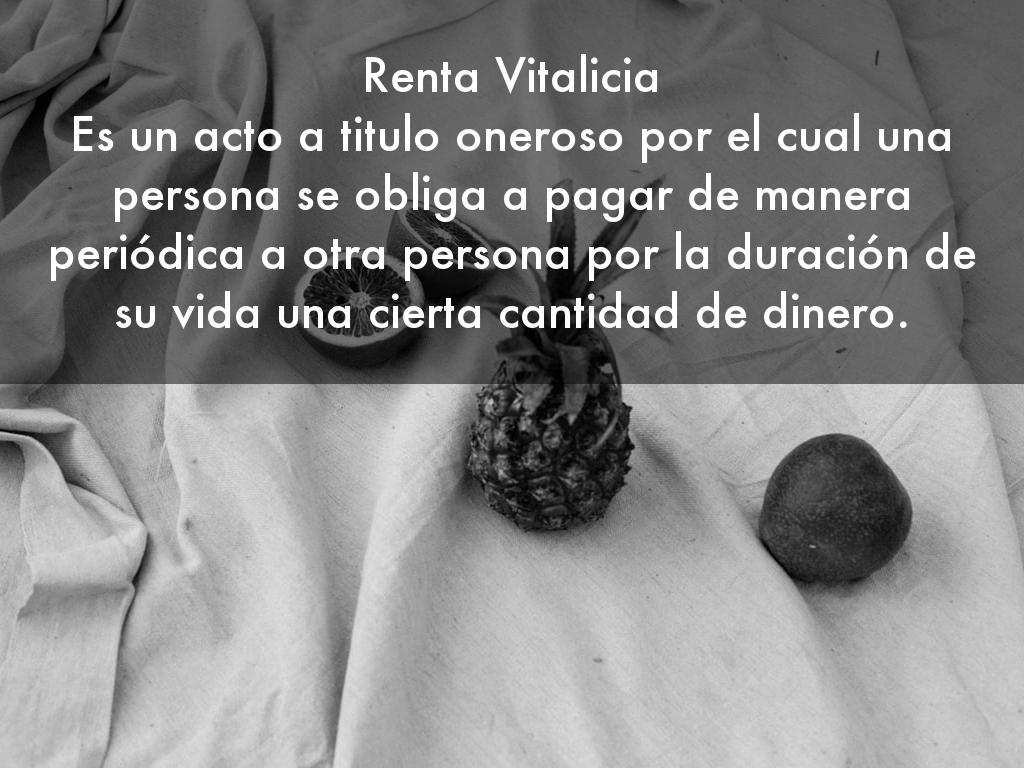 Renta Vitalicia Es un acto a titulo oneroso por el cual una persona se obliga a pagar de manera periódica a otra persona por la duración de su vida una cierta cantidad de dinero.