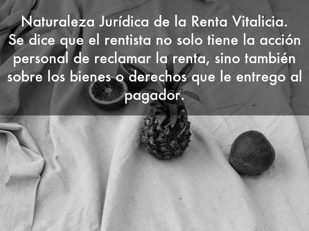 Naturaleza Jurídica de la Renta Vitalicia. Se dice que el rentista no solo tiene la acción personal de reclamar la renta, sino también sobre los bienes o derechos que le entrego al pagador.