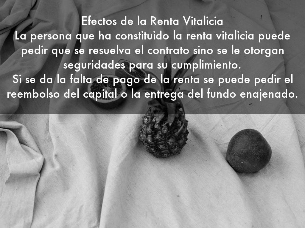 Efectos de la Renta Vitalicia La persona que ha constituido la renta vitalicia puede pedir que se resuelva el contrato sino se le otorgan seguridades para su cumplimiento. Si se da la falta de pago de la renta se puede pedir el reembolso del capital o la entrega del fundo enajenado.