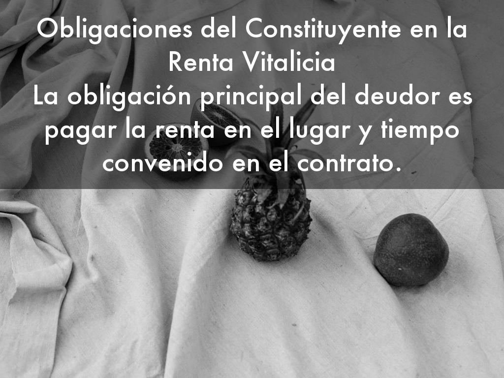 Obligaciones del Constituyente en la Renta Vitalicia La obligación principal del deudor es pagar la renta en el lugar y tiempo convenido en el contrato.