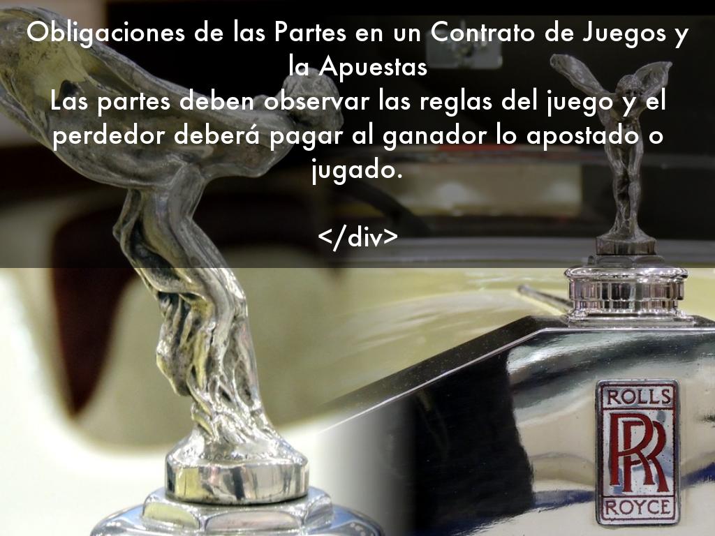 Obligaciones de las Partes en un Contrato de Juegos y la Apuestas Las partes deben observar las reglas del juego y el perdedor deberá pagar al ganador lo apostado o jugado.