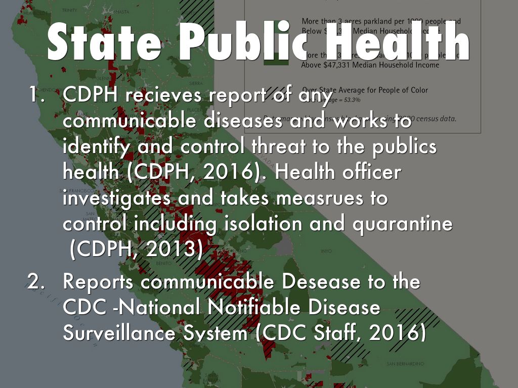 CDPH recieves report of any communicable diseases and works to identify and control threat to the publics health (CDPH, 2016). Health officer investigates and takes measrues to control including isolation and quarantine (CDPH, 2013)