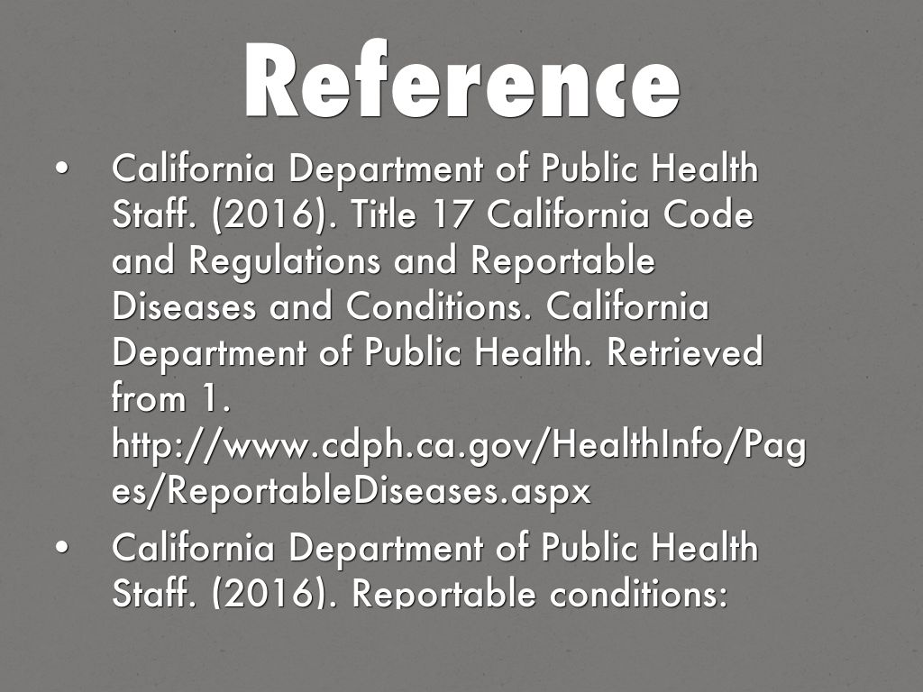 California Department of Public Health Staff. (2016). Title 17 California Code and Regulations and Reportable Diseases and Conditions. California Department of Public Health. Retrieved from 1. http://www.cdph.ca.gov/HealthInfo/Pages/ReportableDiseases.aspx