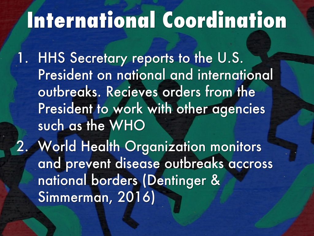 World Health Organization monitors and prevent disease outbreaks accross national borders (Dentinger & Simmerman, 2016)