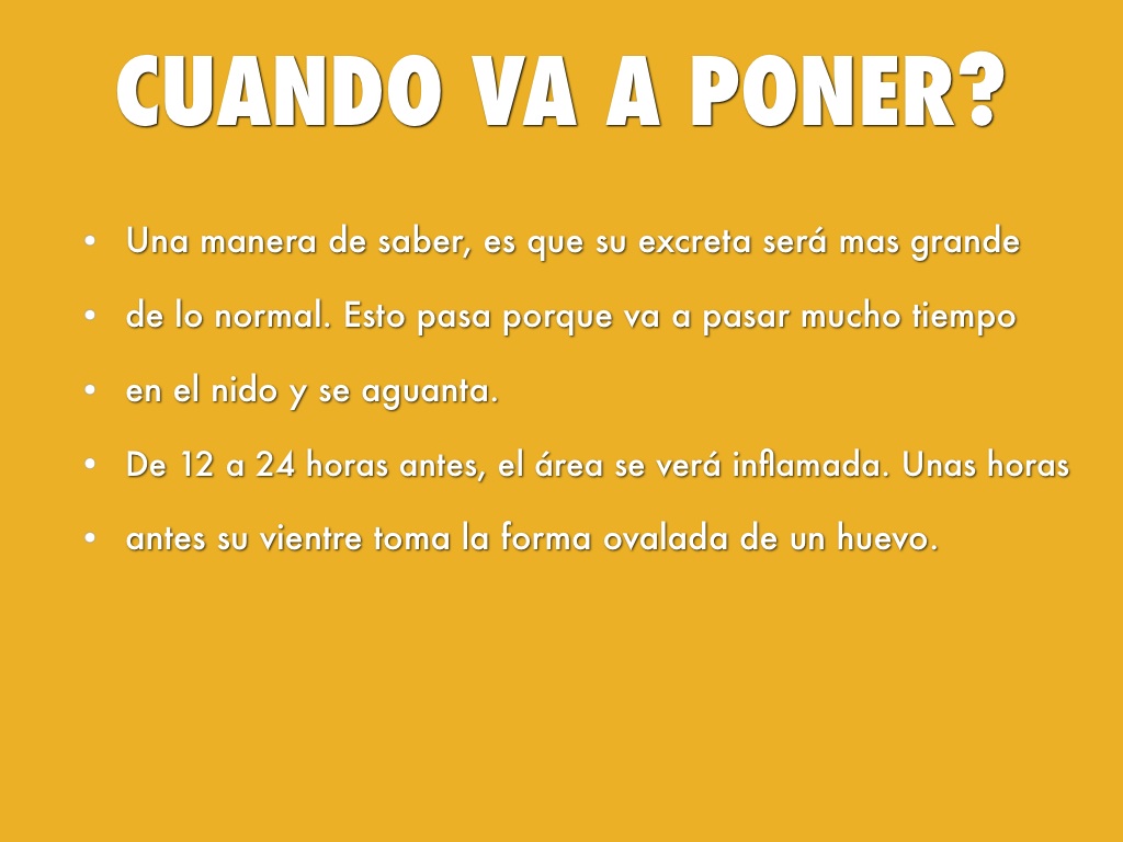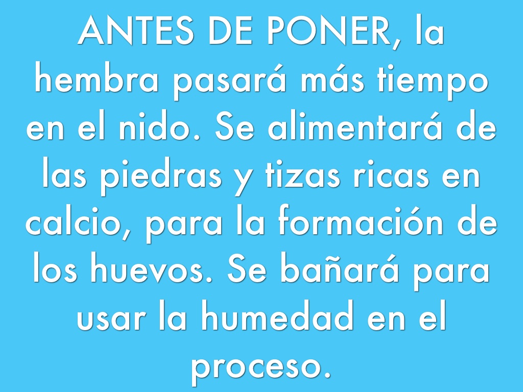 ANTES DE PONER, la hembra pasará más tiempo en el nido. Se alimentará de las piedras y tizas ricas en calcio, para la formación de los huevos. Se bañará para usar la humedad en el proceso.