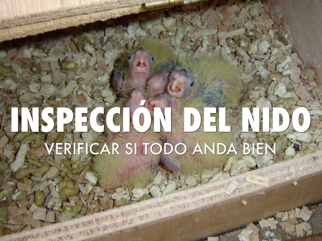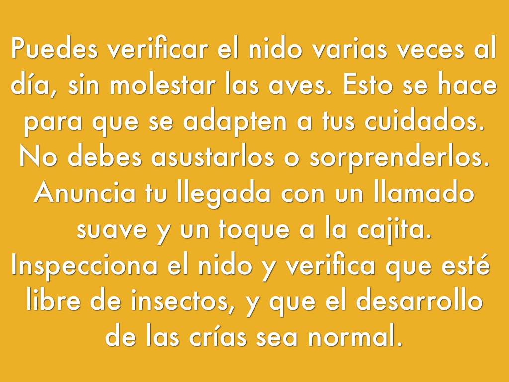 Puedes verificar el nido varias veces al día, sin molestar las aves. Esto se hace para que se adapten a tus cuidados. No debes asustarlos o sorprenderlos. Anuncia tu llegada con un llamado suave y un toque a la cajita. Inspecciona el nido y verifica que esté libre de insectos, y que el desarrollo de las crías sea normal.