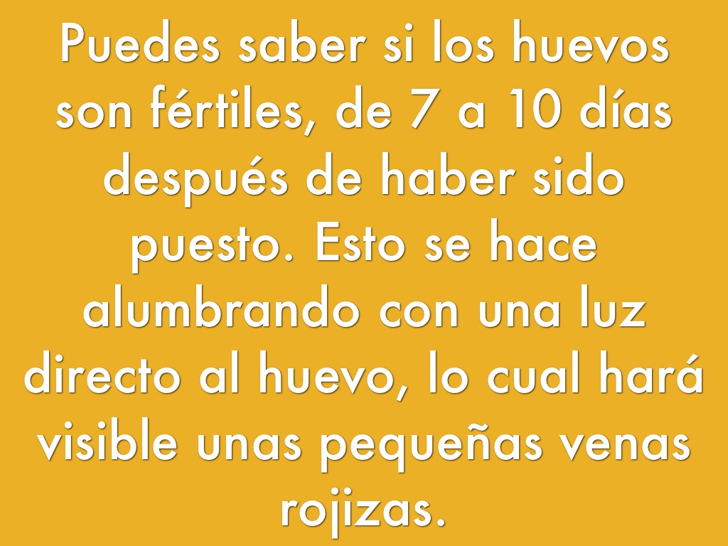 Puedes saber si los huevos son fértiles, de 7 a 10 días después de haber sido puesto. Esto se hace alumbrando con una luz directo al huevo, lo cual hará visible unas pequeñas venas rojizas.