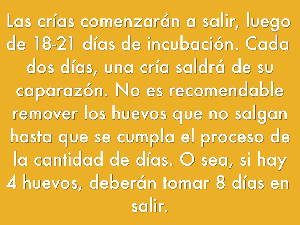 Las crías comenzarán a salir, luego de 18-21 días de incubación. Cada dos días, una cría saldrá de su caparazón. No es recomendable remover los huevos que no salgan hasta que se cumpla el proceso de la cantidad de días. O sea, si hay 4 huevos, deberán tomar 8 días en salir.