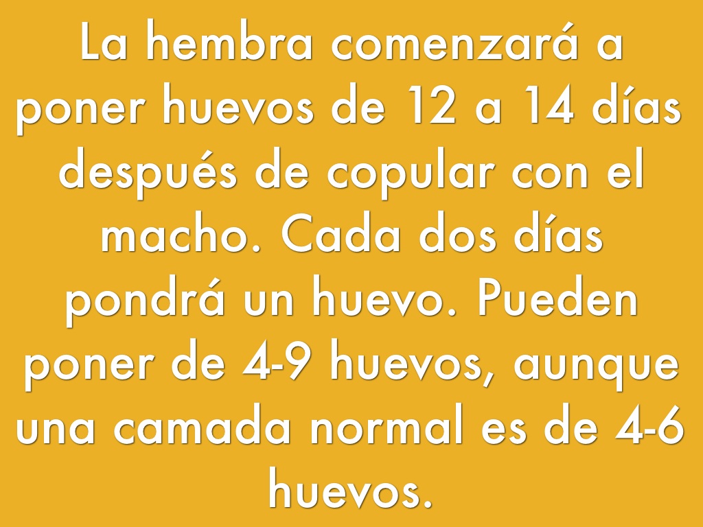 La hembra comenzará a poner huevos de 12 a 14 días después de copular con el macho. Cada dos días pondrá un huevo. Pueden poner de 4-9 huevos, aunque una camada normal es de 4-6 huevos.