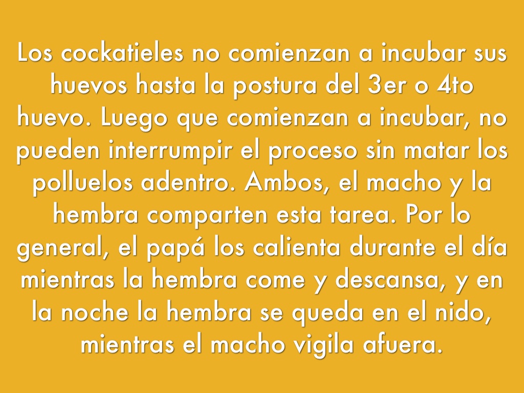 Los cockatieles no comienzan a incubar sus huevos hasta la postura del 3er o 4to huevo. Luego que comienzan a incubar, no pueden interrumpir el proceso sin matar los polluelos adentro. Ambos, el macho y la hembra comparten esta tarea. Por lo general, el papá los calienta durante el día mientras la hembra come y descansa, y en la noche la hembra se queda en el nido, mientras el macho vigila afuera.