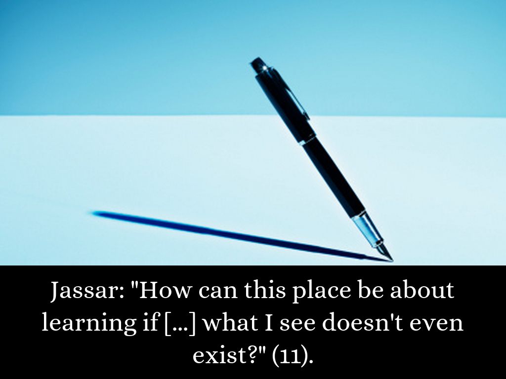 Jassar: "How can this place be about learning if [...] what I see doesn't even exist?" (11).