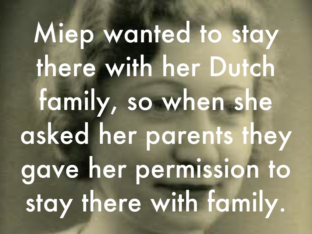 Miep wanted to stay there with her Dutch family, so when she asked her parents they gave her permission to stay there with family.