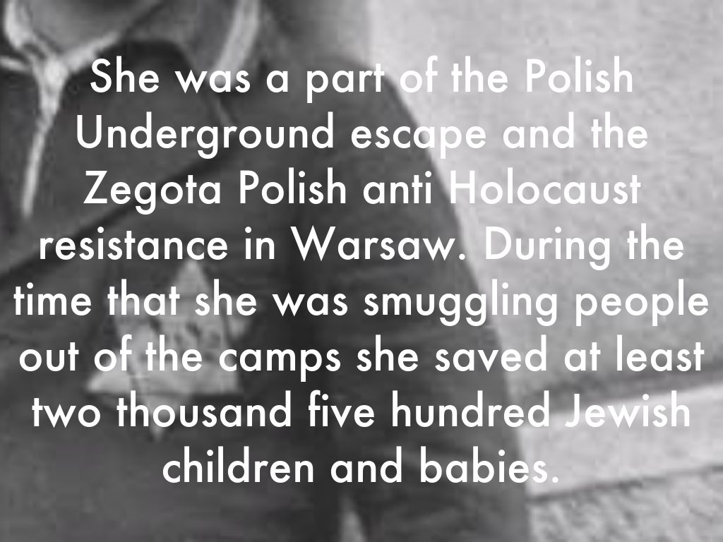 She was a part of the Polish Underground escape and the Zegota Polish anti Holocaust resistance in Warsaw. During the time that she was smuggling people out of the camps she saved at least two thousand five hundred Jewish children and babies.