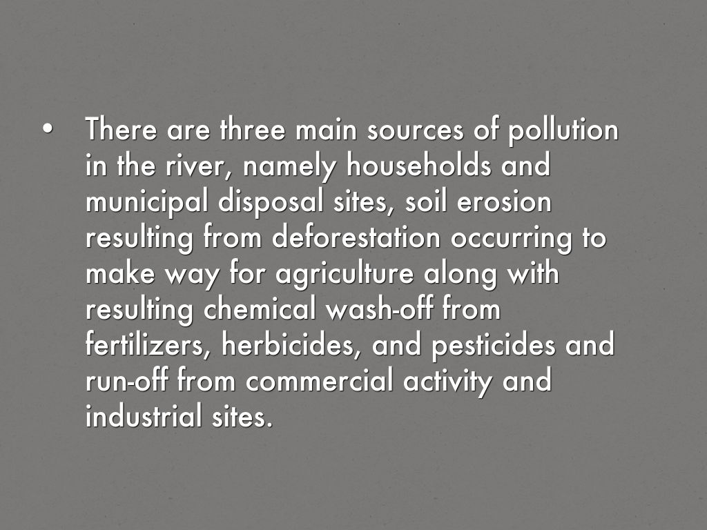 There are three main sources of pollution in the river, namely households and municipal disposal sites, soil erosion resulting from deforestation occurring to make way for agriculture along with resulting chemical wash-off from fertilizers, herbicides, and pesticides and run-off from commercial activity and industrial sites.