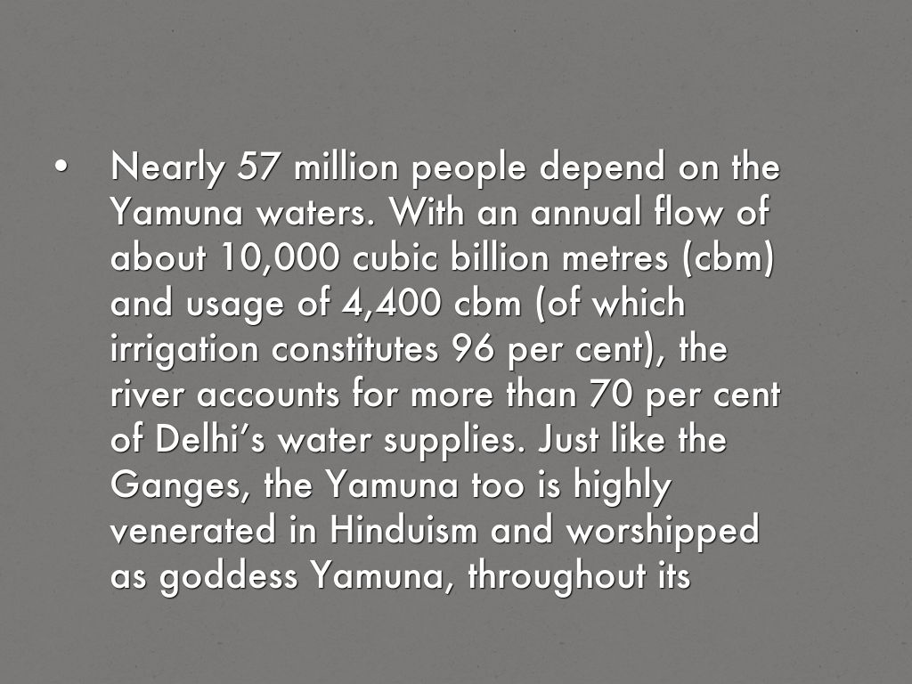 Nearly 57 million people depend on the Yamuna waters. With an annual flow of about 10,000 cubic billion metres (cbm) and usage of 4,400 cbm (of which irrigation constitutes 96 per cent), the river accounts for more than 70 per cent of Delhi’s water supplies. Just like the Ganges, the Yamuna too is highly venerated in Hinduism and worshipped as goddess Yamuna, throughout its course.