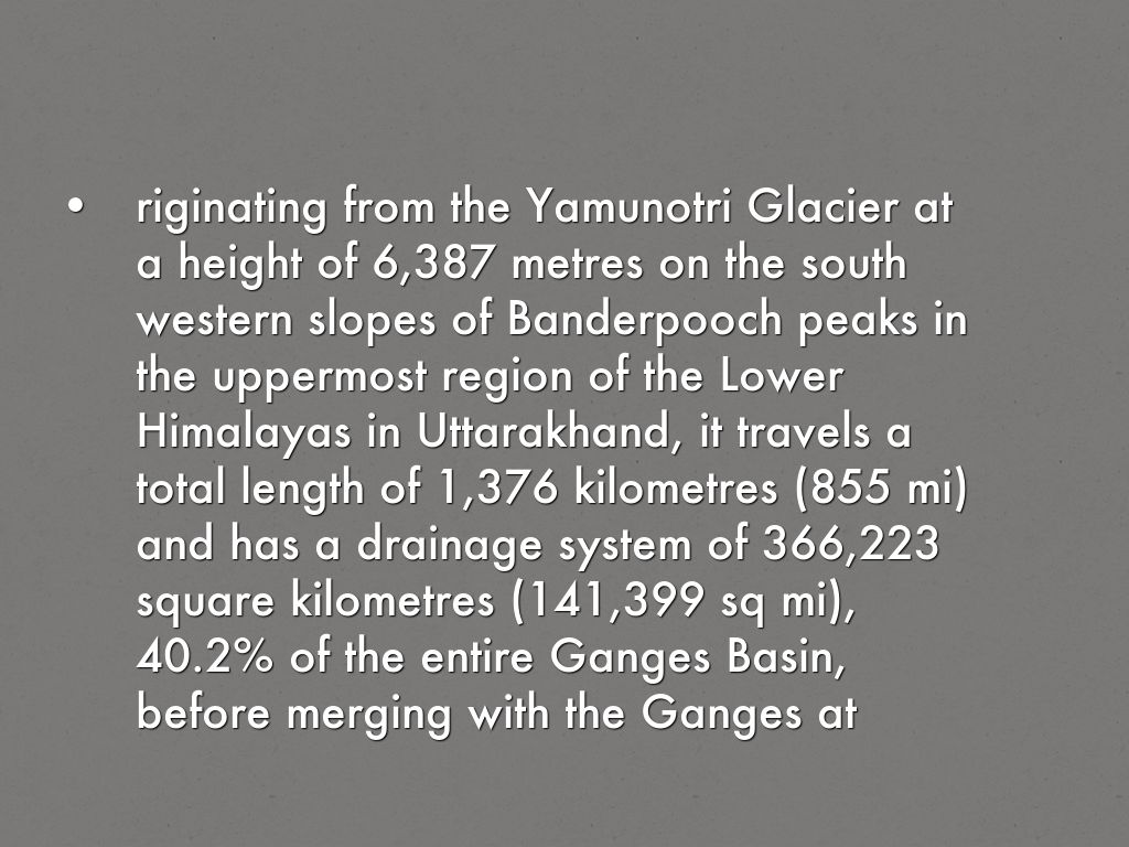 riginating from the Yamunotri Glacier at a height of 6,387 metres on the south western slopes of Banderpooch peaks in the uppermost region of the Lower Himalayas in Uttarakhand, it travels a total length of 1,376 kilometres (855 mi) and has a drainage system of 366,223 square kilometres (141,399 sq mi), 40.2% of the entire Ganges Basin, before merging with the Ganges at Triveni Sangam, Allahabad, the site for the Kumbha Mela every twelve years. It is the longest river in India which does not directly flow to the sea.