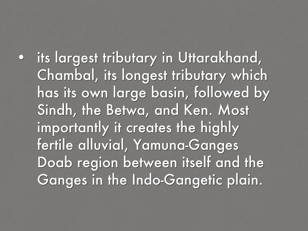 its largest tributary in Uttarakhand, Chambal, its longest tributary which has its own large basin, followed by Sindh, the Betwa, and Ken. Most importantly it creates the highly fertile alluvial, Yamuna-Ganges Doab region between itself and the Ganges in the Indo-Gangetic plain.