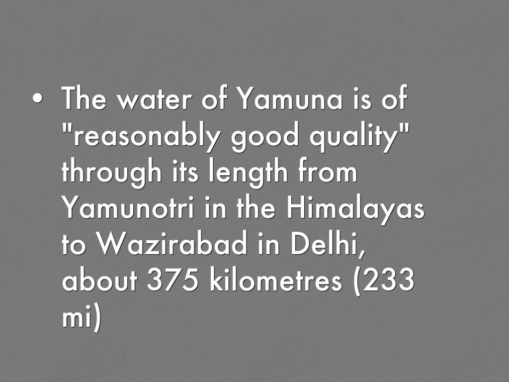 The water of Yamuna is of "reasonably good quality" through its length from Yamunotri in the Himalayas to Wazirabad in Delhi, about 375 kilometres (233 mi)