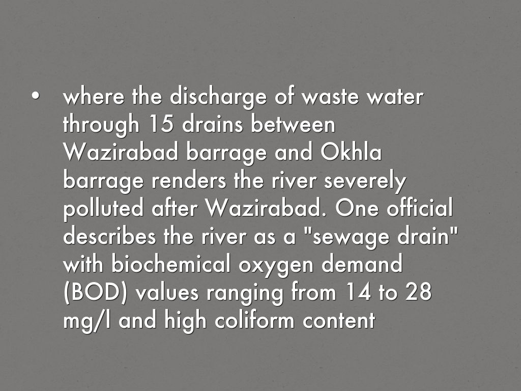where the discharge of waste water through 15 drains between Wazirabad barrage and Okhla barrage renders the river severely polluted after Wazirabad. One official describes the river as a "sewage drain" with biochemical oxygen demand (BOD) values ranging from 14 to 28 mg/l and high coliform content