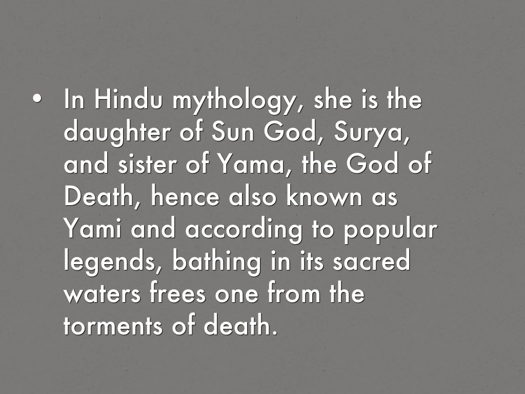 In Hindu mythology, she is the daughter of Sun God, Surya, and sister of Yama, the God of Death, hence also known as Yami and according to popular legends, bathing in its sacred waters frees one from the torments of death.