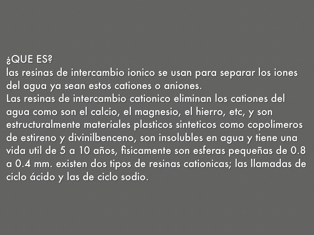 las resinas de intercambio ionico se usan para separar los iones del agua ya sean estos cationes o aniones.