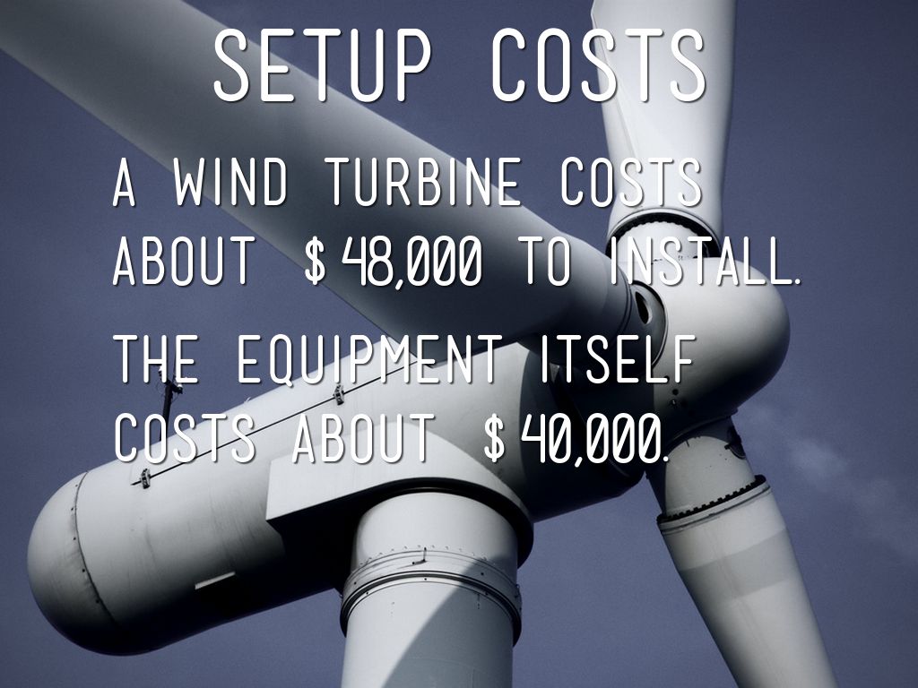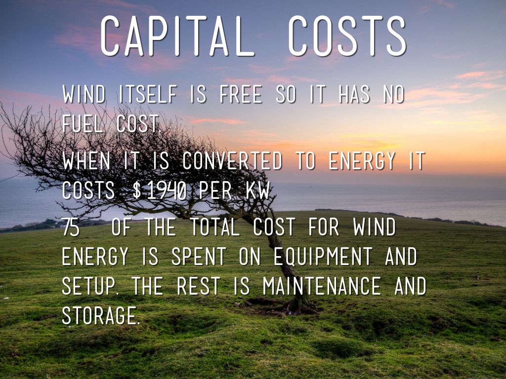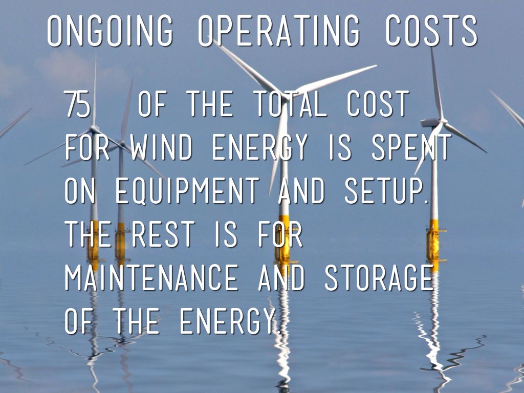 75% of the total cost for wind energy is spent on equipment and setup. The rest is maintenance and storage.
